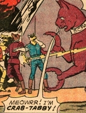 Crab Tabby has crab claws in place of paws. Crab Tabby is part of the Space Cat Patrol Agents (SB No. 131/3, Jul 1966: "The Dog from S.C.P.A!").